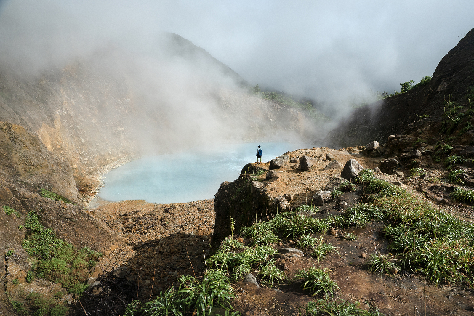 Une activité volcanique est toujours légèrement active, comme en témoigne la présence d'un lac en ébullition, le Boiling Lake, (le second du monde par sa taille) et la présence d'une "vallée de la désolation" dominicaise. Cette vallée est alimentée par des sources chaudes souffrées qui empêchent le développement de toute vie végétale, contrastant ainsi avec les forêts tropicales environnantes. Au sud-ouest de l'île, sur la côte, se trouve les vestiges d'une grande caldeira sous-marine dont la partie Est forment la presqu'île de Scott head, le paradis des plongeurs. Environ 70 000 habitants peuplent la Dominique, répartis principalement sur la côte ouest, notamment à Roseau la capitale, et à Portsmouth au nord. Sur la cote est, dans un territoire cédé par la Reine d’Angleterre en 1903, vit encore la dernière communauté d’ Indiens Caraïbes, les Kalinagos, regroupant environ 3000 individus. Les Dominicais affirment que c’est sans doute la seule île que Christophe Colomb reconnaîtrait s’il était encore de ce monde.